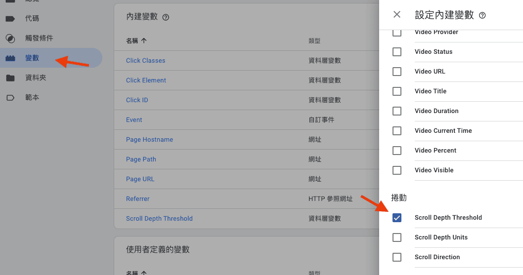 啟用內建變數Scroll Depth Threshold,拿來當作事件價值使用。