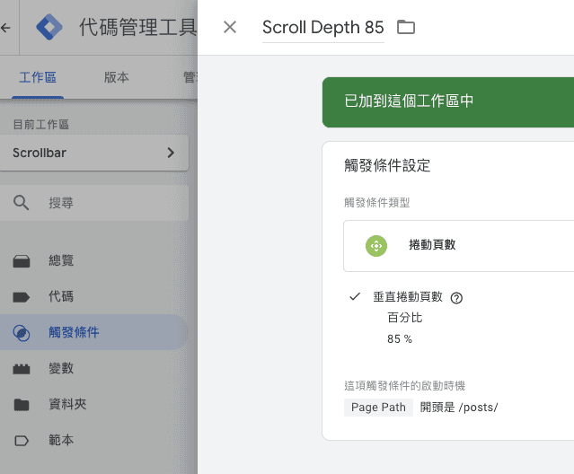 新增捲動深度的觸發條件,勾選捲動深度後分別設置 40 與 85 百分比,出發條件鎖定在文章頁面,開頭為 /posts/。