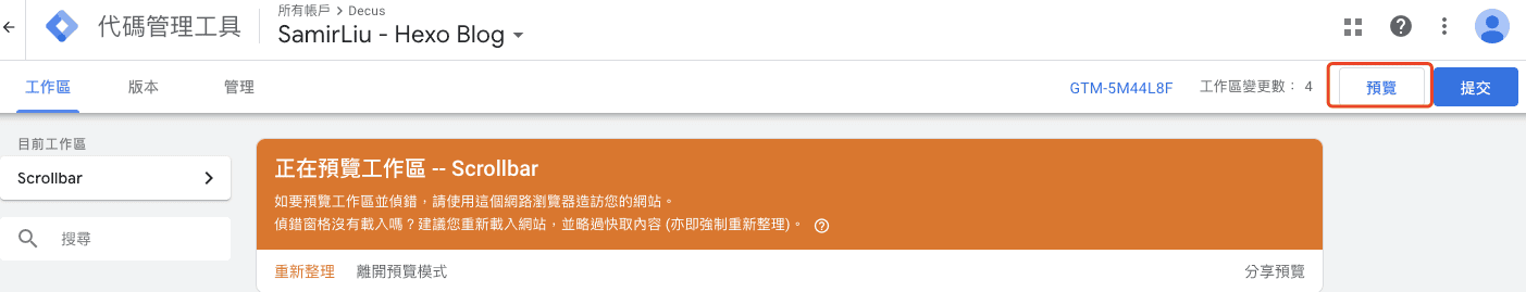 在 Google Tag Manager 右上角有個預覽按鈕,按下後出現橘色的框框即進入預覽模式。