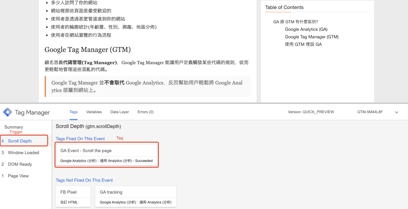 本站屬於技術分享的文章,最好的互動就是閱讀文章的深度,透過 GTM 可以簡單的設置當捲動深度達到目標百分比時當作是轉換。本篇可以拆分成三個部分:GTM 事件設定、GTM Debug、GA 目標設定。