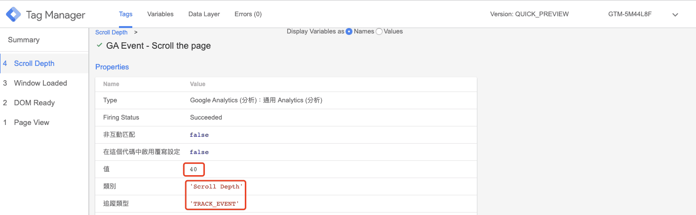 接著點入 Tag,可以確認 Tag 被觸發時所帶的變數是否符合預期。