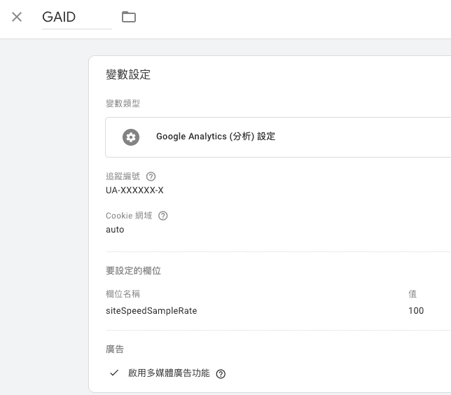 Google Analytics (分析) 設定,這變數好用在設定代碼時,不用每次都填入 GA Tracking ID 與相關的設定。