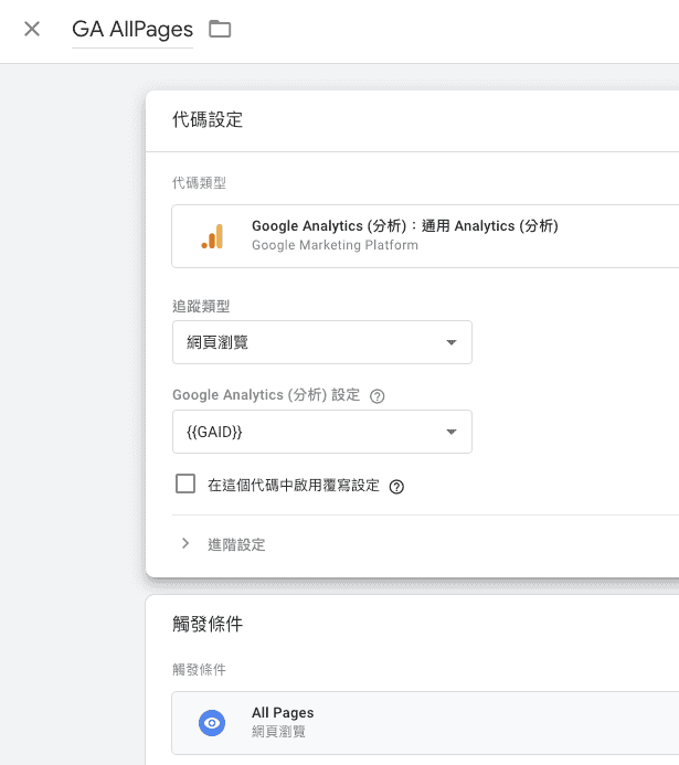 使用預設模板Google Analytics (分析) – 通用 Analytics (分析),選擇變數GAID,選擇觸發條件All Pages,設置完後發佈。